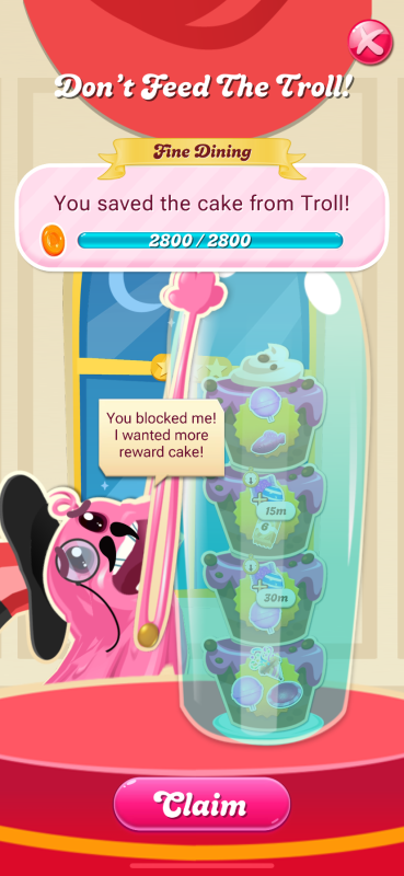 I've managed to complete the first two tiers (2,000 and 2,500 orange candies, respectively) with all pieces of cake intact, but the third tier (2,800 orange candies) remains out of reach. In order to complete the third tier without the Bubblegum Troll eating a piece of the cake, you have to turn on the higher game speed in Settings and breeze through as many levels as possible on your first try while minimizing the number of ads you watch. Unless you find yourself on a level that gives you tons of orange candies and allows you to stall easily, the timing is extremely tight. You will not complete this in one episode, so watching the ads at the end of an Episode/Champions Race might prove to be a liability. If you do watch those ads, then everything else has to be perfect.
