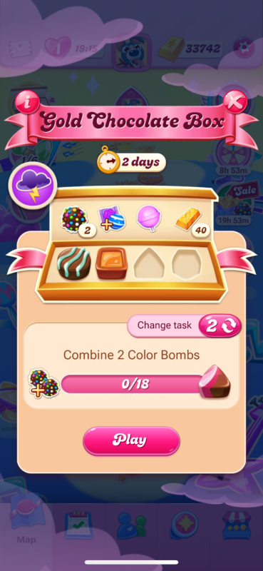 Also, how one can know which Chocolate Box style you will get if your current box expires and you start over with a Classic Box as on that box you can't really know if you will receive old or new box style tasks. The box that wasn't able to be progressed was on the new style. The last box that was finished with 3 UFO was also new style as the third task had Orange in new levels and was changed for the Color Bombs task.