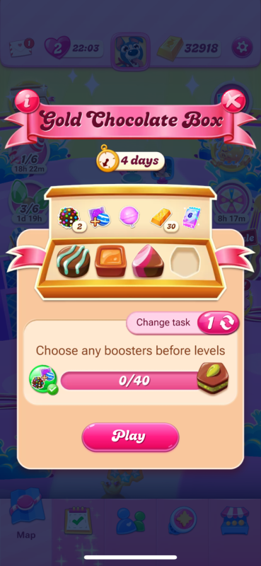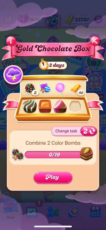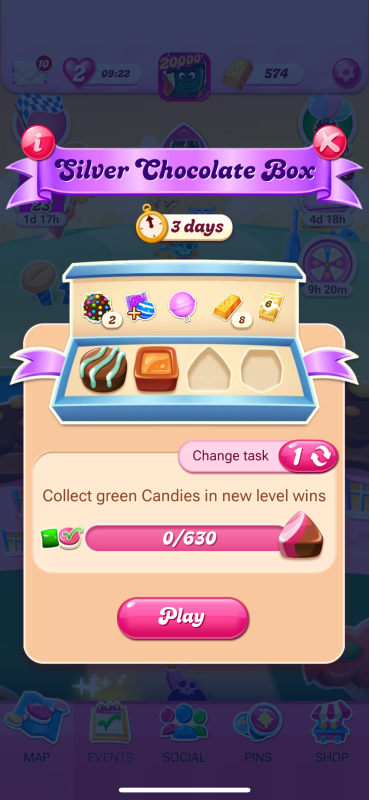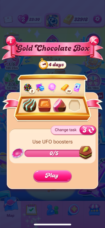 Also, how one can know which Chocolate Box style you will get if your current box expires and you start over with a Classic Box as on that box you can't really know if you will receive old or new box style tasks. The box that wasn't able to be progressed was on the new style. The last box that was finished with 3 UFO was also new style as the third task had Orange in new levels and was changed for the Color Bombs task.