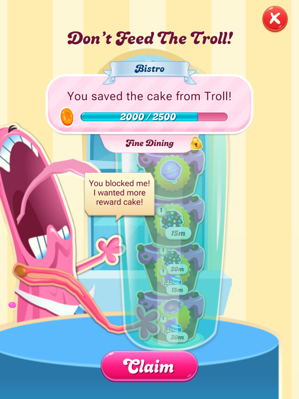 I didn't want to disappoint Sativa @MountainMom so, I did not comment in that thread: To truly beat the troll we need to get the piece of cake at the bottom that has the party popper. We only have 45 minutes for that. After that slice is gone we then get another 45 minutes to beat the troll to the next slice. This is what Sative achieved.