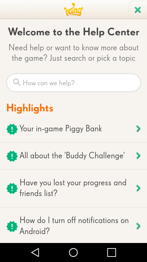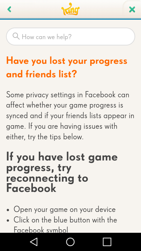 ** Select "Help Center" -- then, select "Have you lost your progress and friends list";