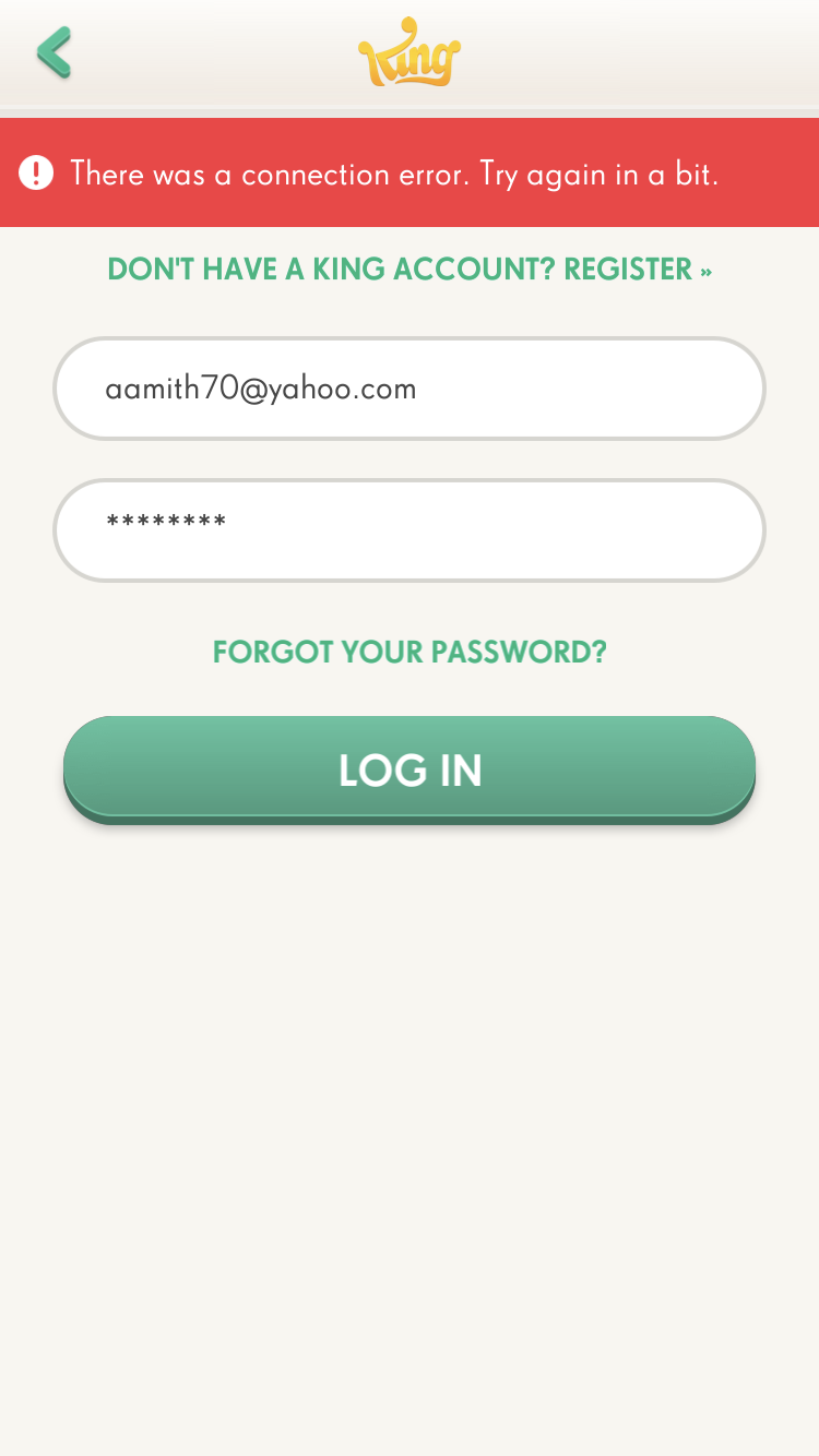 for the past couple of weeks I have not been able to connect to any King games either through Facebook or directly through King games. I have attached a screenshot. ย