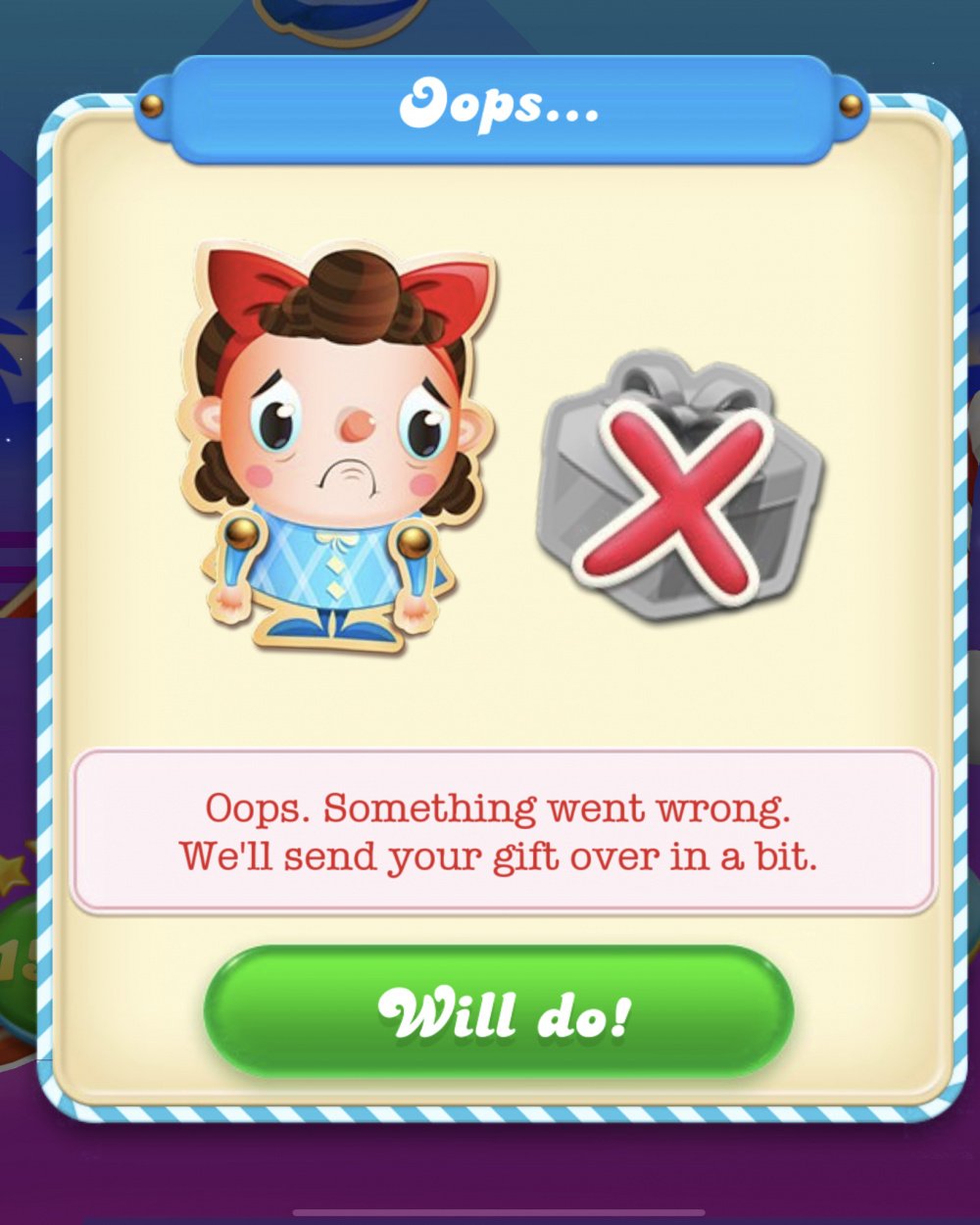 Very sorry about that but the only solution to this error is reinstallation of the application. Its a very complex issue and reinstallation can only rectify it. Sorry you will lose your boosters and lives and not recoverable unless purchased.