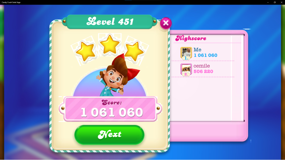 In order to join the cool Million Member Club all you will need to do is to post a screenshot of any replayed Soda level showing a score with over a million, the screenshot which must display the word ‘Next’ showing that the level has been completed. Scores in highscore bar and old or borrowed score screenshots are not considered valid.