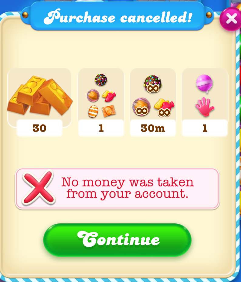 Has anyone received the below Purchase Cancelled notification when playing Candy Crush Soda Saga? I've tried everything that the King Player Support has suggested with no luck. Any suggestions?