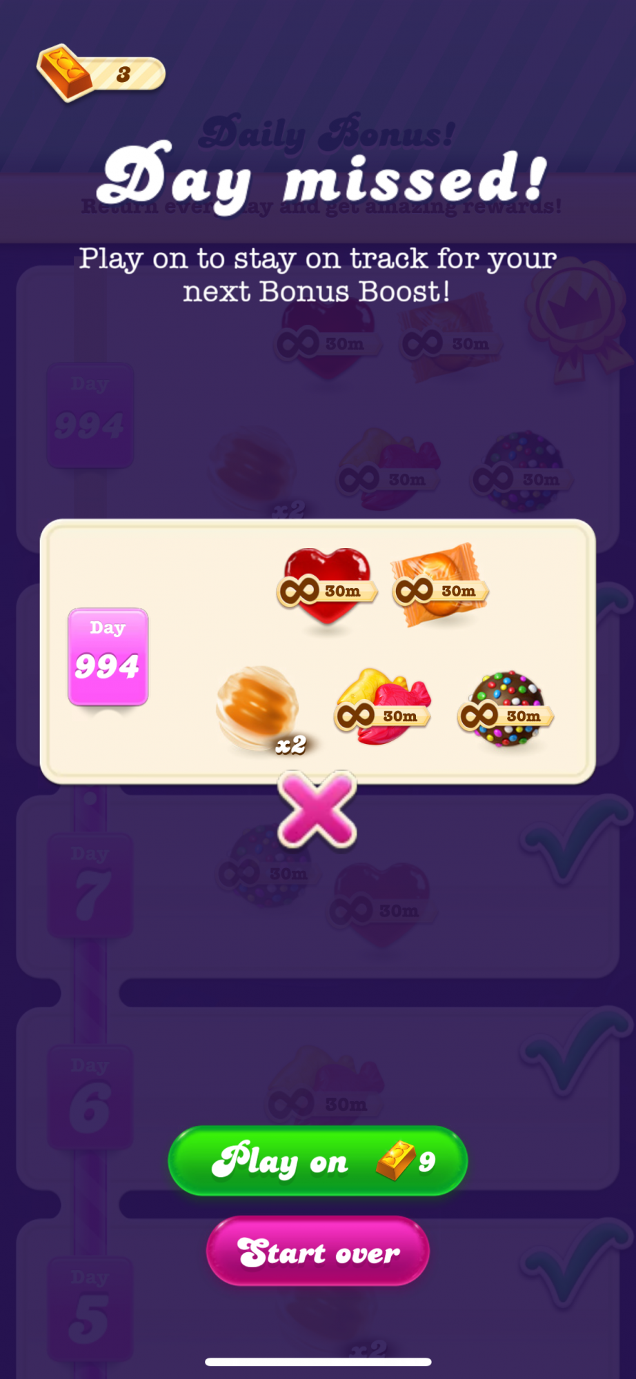 When I went to play, it said I missed a day ( I hadn’t and now it’s been 3 days unable to play) and it shows me this screen. No changes. What’s going on??