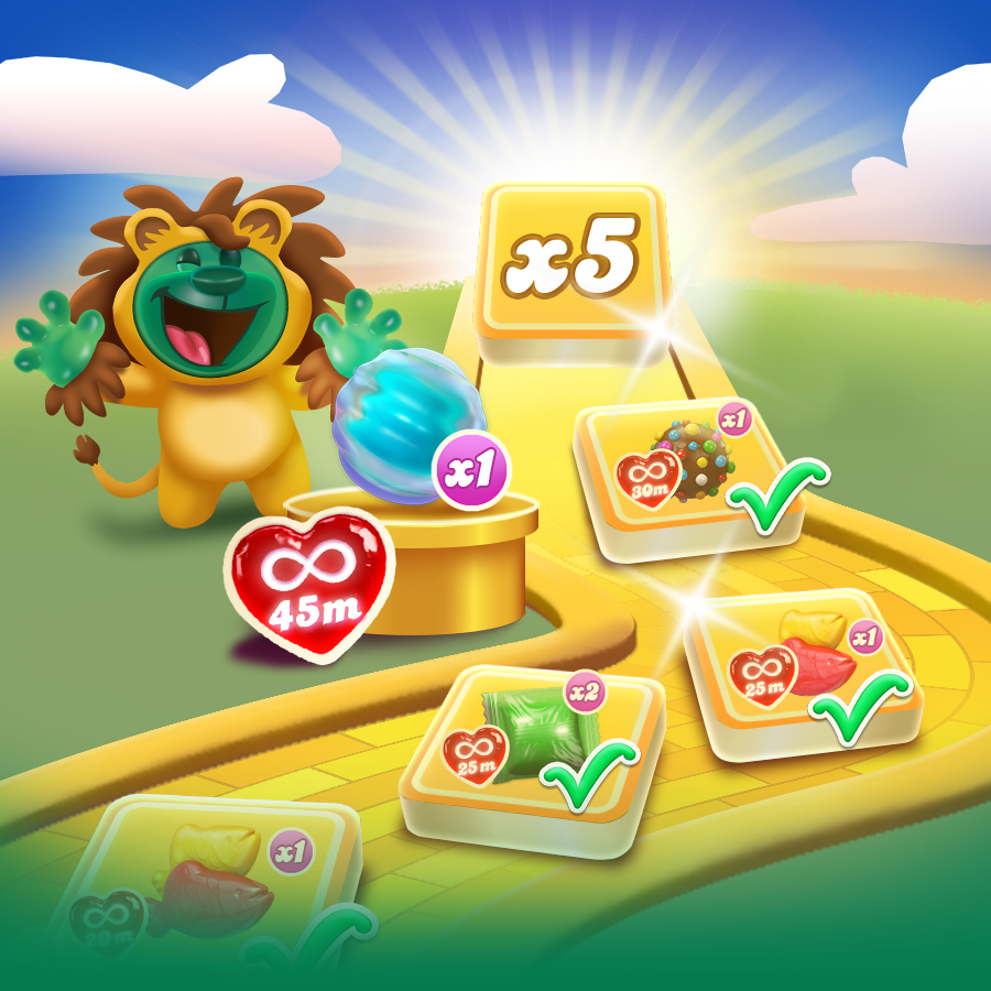 A lion-bear is leading the way down a trail of tasty challenges! 🦁🐻 Win levels to collect Golden Pins and unlock tiered rewards along the path. Each step gets trickier… but the prizes grow sweeter!