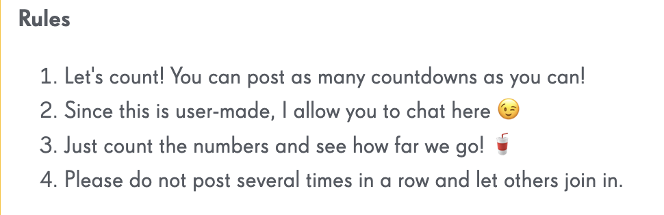 Let's count in Soda guys! Rules Let's count! You can post as many countdowns as you can! Since this is user-made, I allow you to chat here π Just count the numbers and see how far we go! π₯€ Please do not post several times in a row and let others join in. Let's Go!