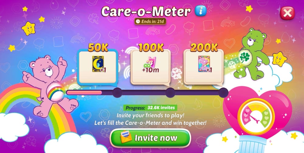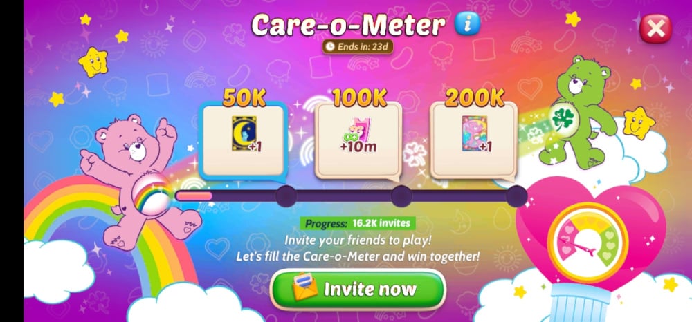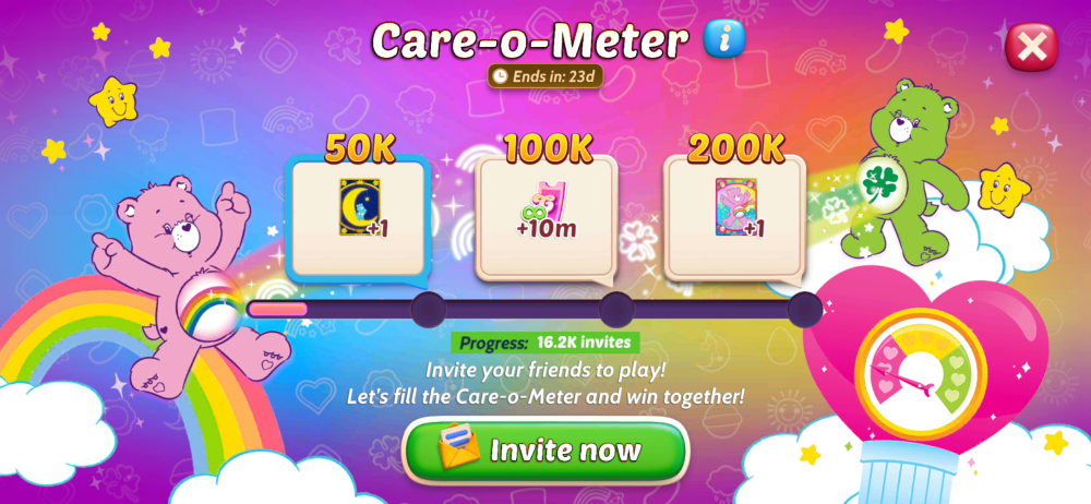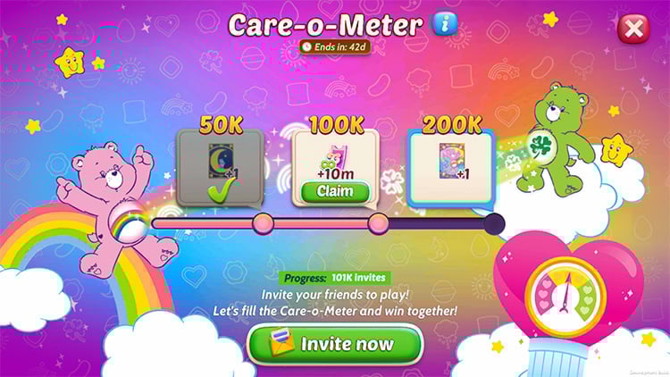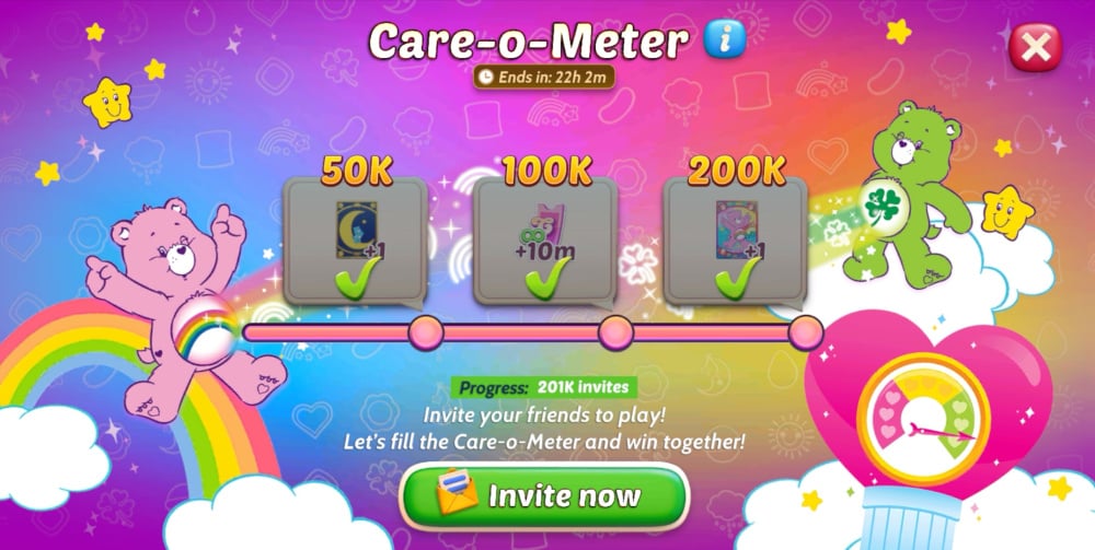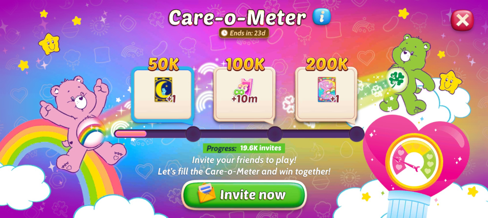 Invite your friends and fill up the Care-O-Meter together! The more friends you bring, the more sweet rewards await you including two adorable Care Bears card decks! ๐