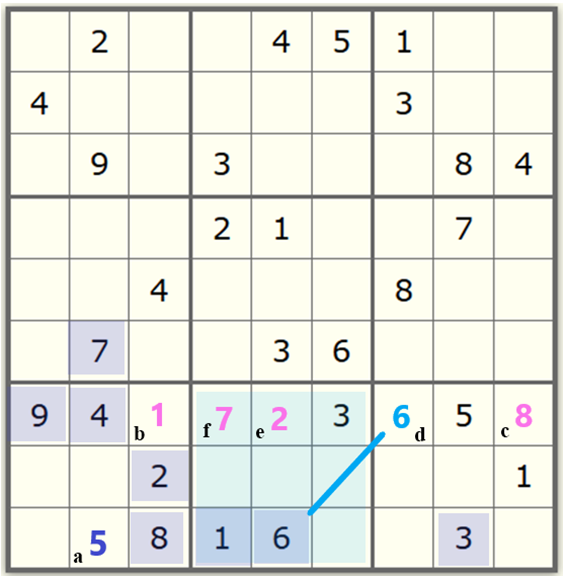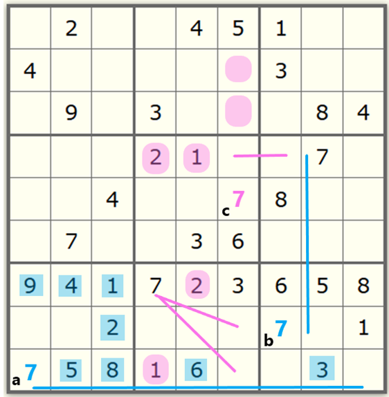 (c ) In order to place #7 in c6r5, you have to look at the 2s and 1s highlighted in pink that since these two numbers cannot be repeated in columns 4 and 5 as well as in the middle block or first band second stack, the only squares these will be place are in c6r2 and 3. You don't need to know the order at this time. They will just serve as aids in solving square c6r5. Look at the middle block in the third band, since there's already a 7, therefore the squares on c7r8 and 9 cannot be a 7 again. So, only square c6r5 is the only one left to put this 7.