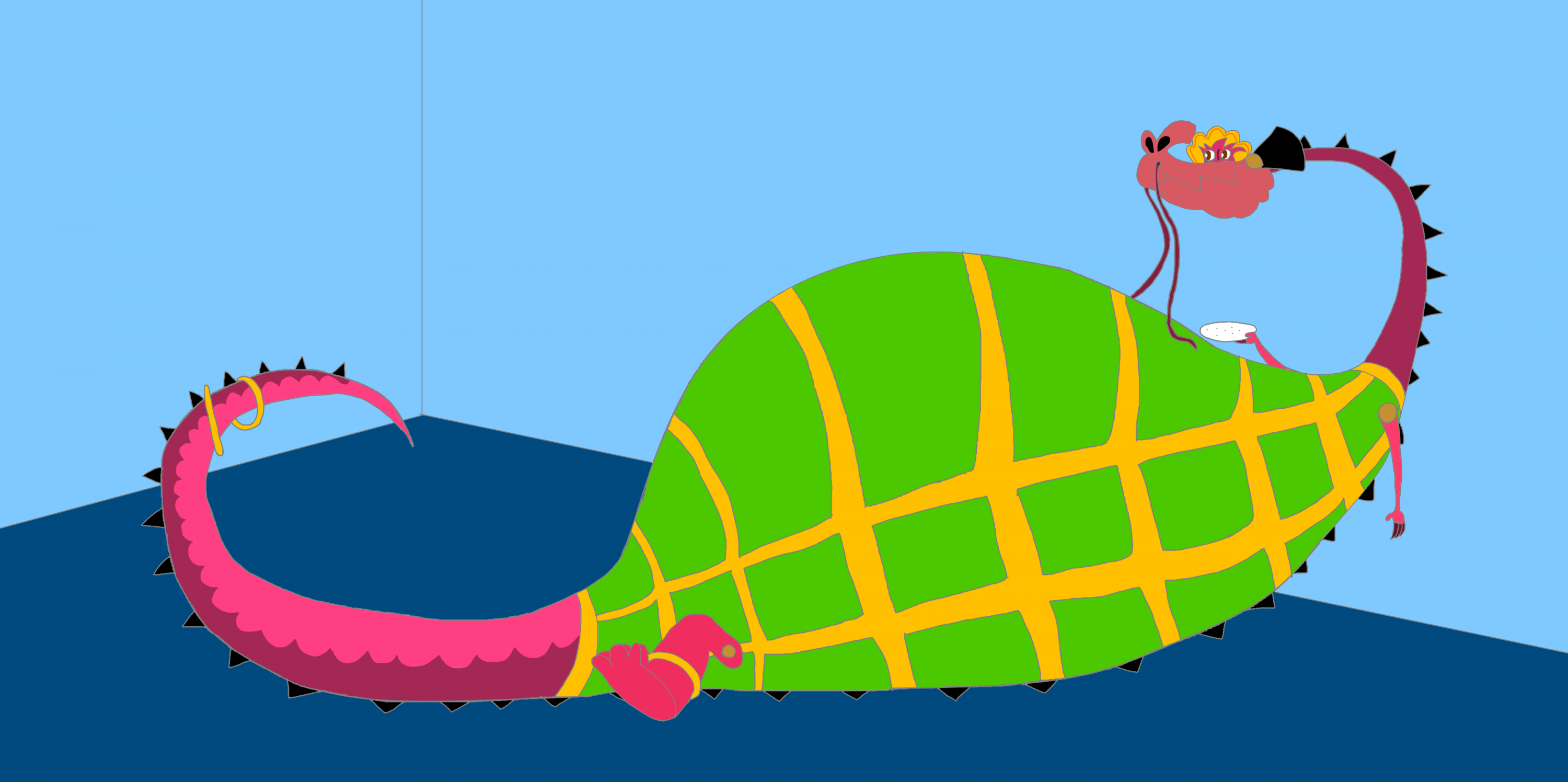 I just wanted to put up this silly Denize fan art just because I think it's just funny to imagine a snakelike monster with a big mouth like her getting too ravenous for food to the point where she gets herself stuffed. Note the extra bumps on the back of her jaws to indicate the copious quantities of food she's chewing on. I thought about drawing her Gummy Gala dress (which I faithfully reproduced from the official graphics) tearing from her spine as her belly stretched a ridiculous proportion, but then again, I thought it would look too risqué and backed down from doing so.