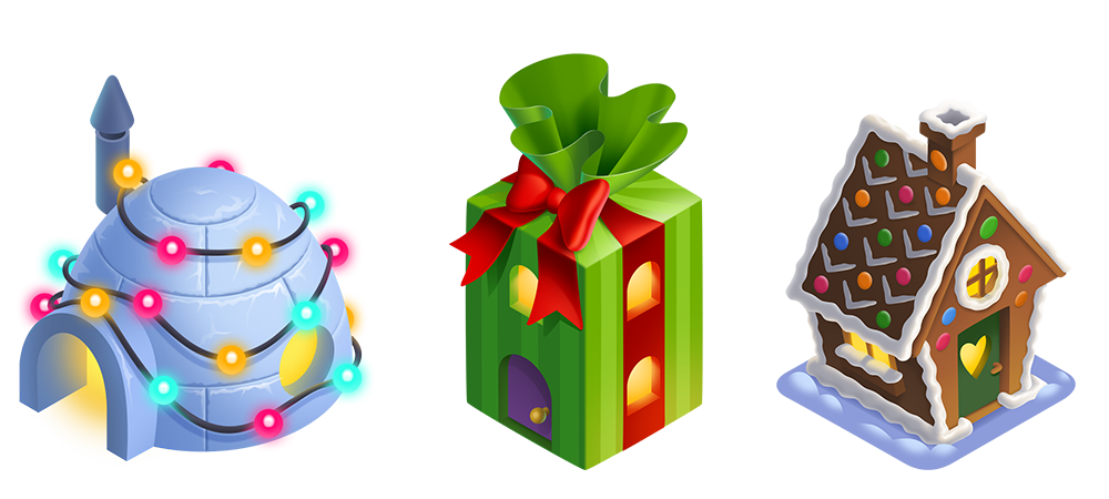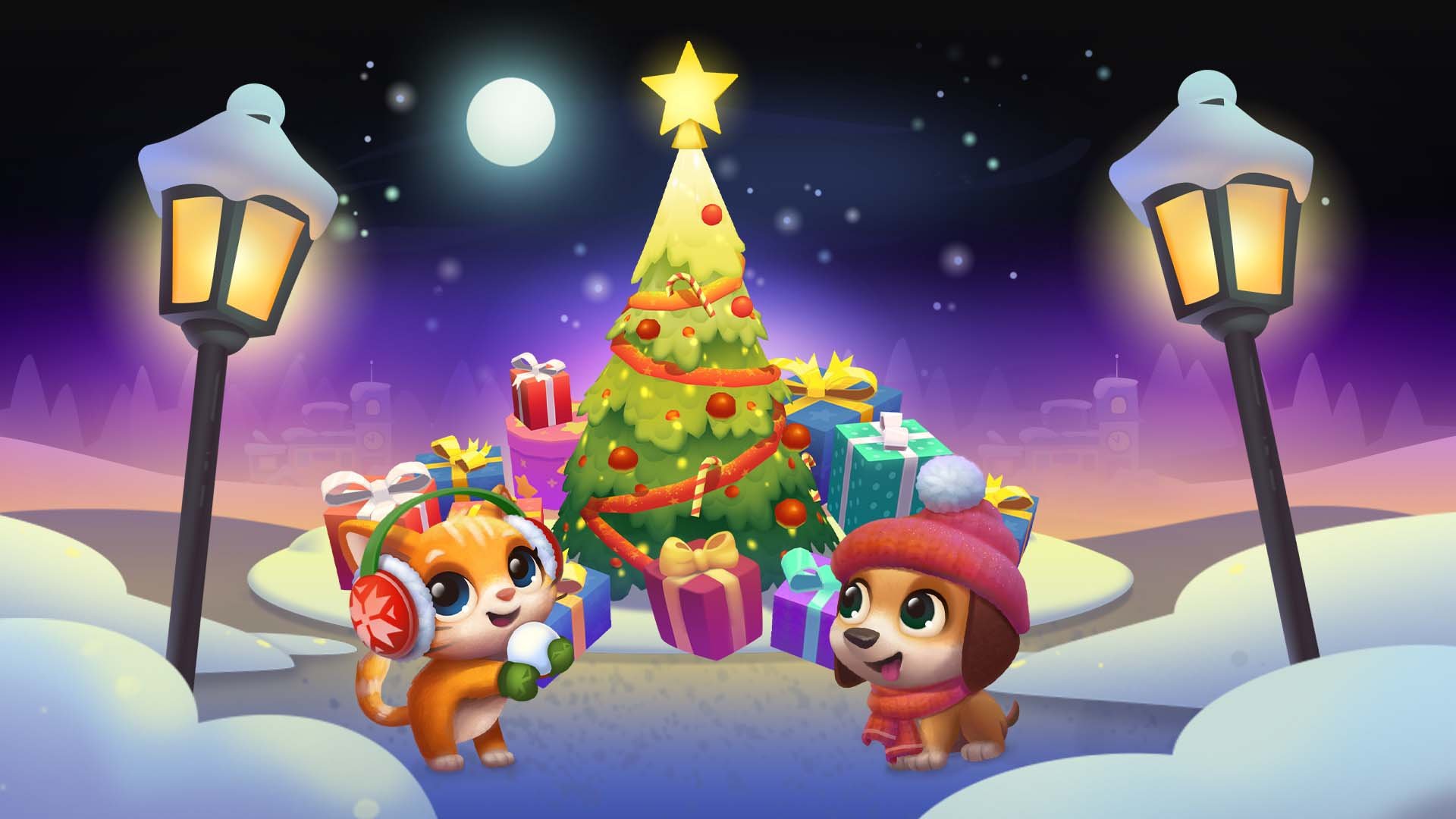 As you play your regular levels, you’ll collect special houses, place them wherever you like, and watch your winter city come to life with gingerbread rooftops, twinkling trees, igloos… and lots of happy pets roaming around!
