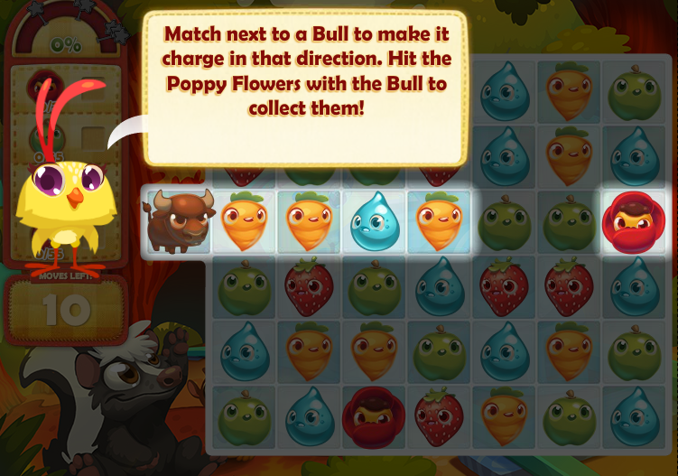 Bulls first appear on level 706 and can be daunting at first. If you rushed through the explanation, here is a little help to remind you. Once moved the bull will keep moving in the same direction, only stopping when it hits the edge of the board or an obstacle, like the flower, or a spiders web etc.